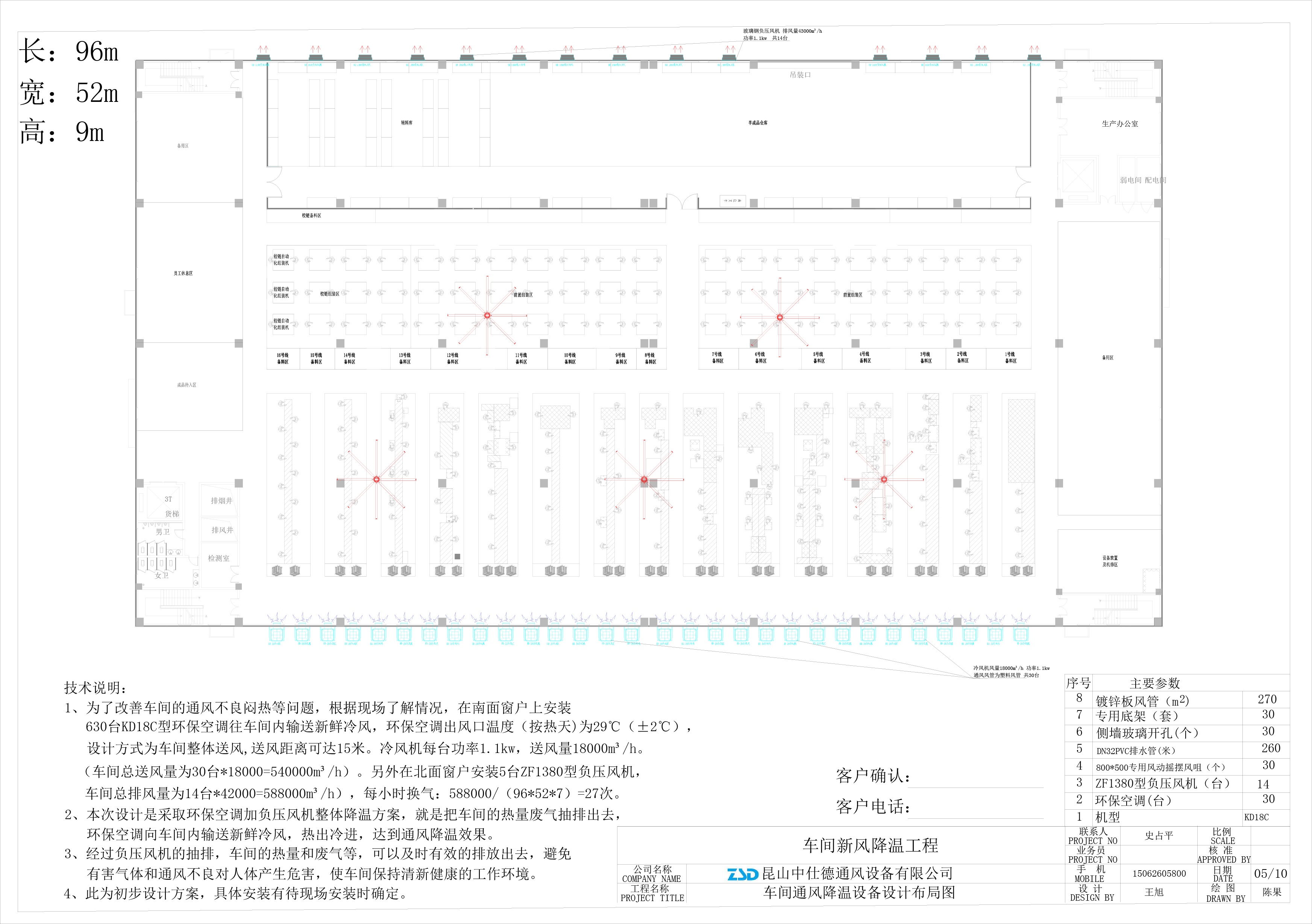 該平面布局圖示是江蘇泰州一家知名鋁制品制造企業(yè)的一個生產(chǎn)車間,屬典型的鋼結(jié)構(gòu)建筑。車間面積約5000平方米,屋面離地高度9.5米,改善前夏季溫度可達(dá)36-39℃,用戶欲進行環(huán)境改善,首先是期望該車間可實現(xiàn)整體通風(fēng),再者對于環(huán)境溫度提出要求,讓工作人員不會因為高溫而流汗工作。依據(jù)要求,本公司設(shè)計部門結(jié)合用戶實際需求,遵循國家標(biāo)準(zhǔn)及自身多年的廠房車間通風(fēng)降溫實際經(jīng)驗,從應(yīng)用效果、工程投資、運行費用、空間美觀角度綜合考慮作出了如上優(yōu)化設(shè)計。根據(jù)車間圖紙布局工況、結(jié)合貴司領(lǐng)導(dǎo)意見,經(jīng)公司多名技術(shù)工程師討論后,這次通風(fēng)換氣方案以通風(fēng)排熱,增加氣流流動,運行成本低能耗為目標(biāo),對以上所有工業(yè)車間設(shè)備的各自性能分析,建議使用:冷風(fēng)機+負(fù)壓風(fēng)機排風(fēng)+中仕德工業(yè)大吊扇通風(fēng)換氣方案
