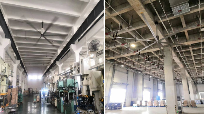5、如果廠房內(nèi)溫度不太高,或廠房降溫要求不高,可采用工業(yè)大風(fēng)扇通風(fēng)方式,工業(yè)大風(fēng)扇運(yùn)行可使其覆蓋區(qū)域空氣加速流動,使人員體感有4-6攝氏度的降溫效果。若配合少量蒸發(fā)式降溫機(jī)組使用效果更佳,能夠使車間溫度降低6-12度。大型工業(yè)風(fēng)扇是高大廠房通風(fēng),人員降溫常用的工業(yè)設(shè)備,一般用于工業(yè)廠房,物流倉庫,候車室,展覽館,體育館、大型鋼結(jié)構(gòu)車間等等,工業(yè)大風(fēng)扇推射大量氣流到地面,在地面形成一定高度的氣流成,促使整體空氣循環(huán),工業(yè)大風(fēng)扇的好處在于全面覆蓋和大風(fēng)量自然風(fēng),所以,工業(yè)大風(fēng)扇方案不僅能為人員降溫,還能使大型空間通風(fēng)換氣,并且靜音省電。